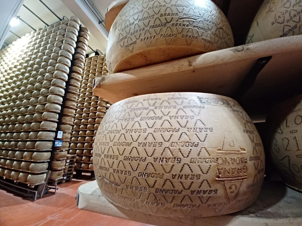 Paolo Raimondi, infine, ci fa un regalo e ci porta a visitare il magazzino in cui vengono trasportate le forme per la stagionatura. Una volta all’interno, insieme ad Arturo siamo colti di sorpresa e allo stesso tempo meravigliati dall’imponenza e dalla quantità di scaffali su cui poggiano le forme di Grana Padano: siamo increduli, tanto che non siamo nemmeno in grado di fare una stima della quantità di forme presenti. E a conferma di questo il proprietario, sciogliendo i nostri dubbi, ci dice che siamo nell’ordine delle centomila unità: davvero impressionante!